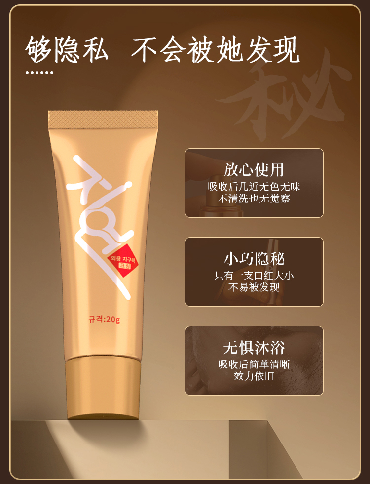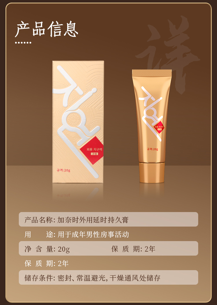 使用方法:使用方法:房事前20分钟,取本品适量涂于茎杆、茎头与茎沟部位,并轻轻按摩,直至胶体看不见。3分钟后重复涂抹一次,持久加倍。涂后第20~180分钟房事更理想。初用者先少后多,试后按需将份量增减